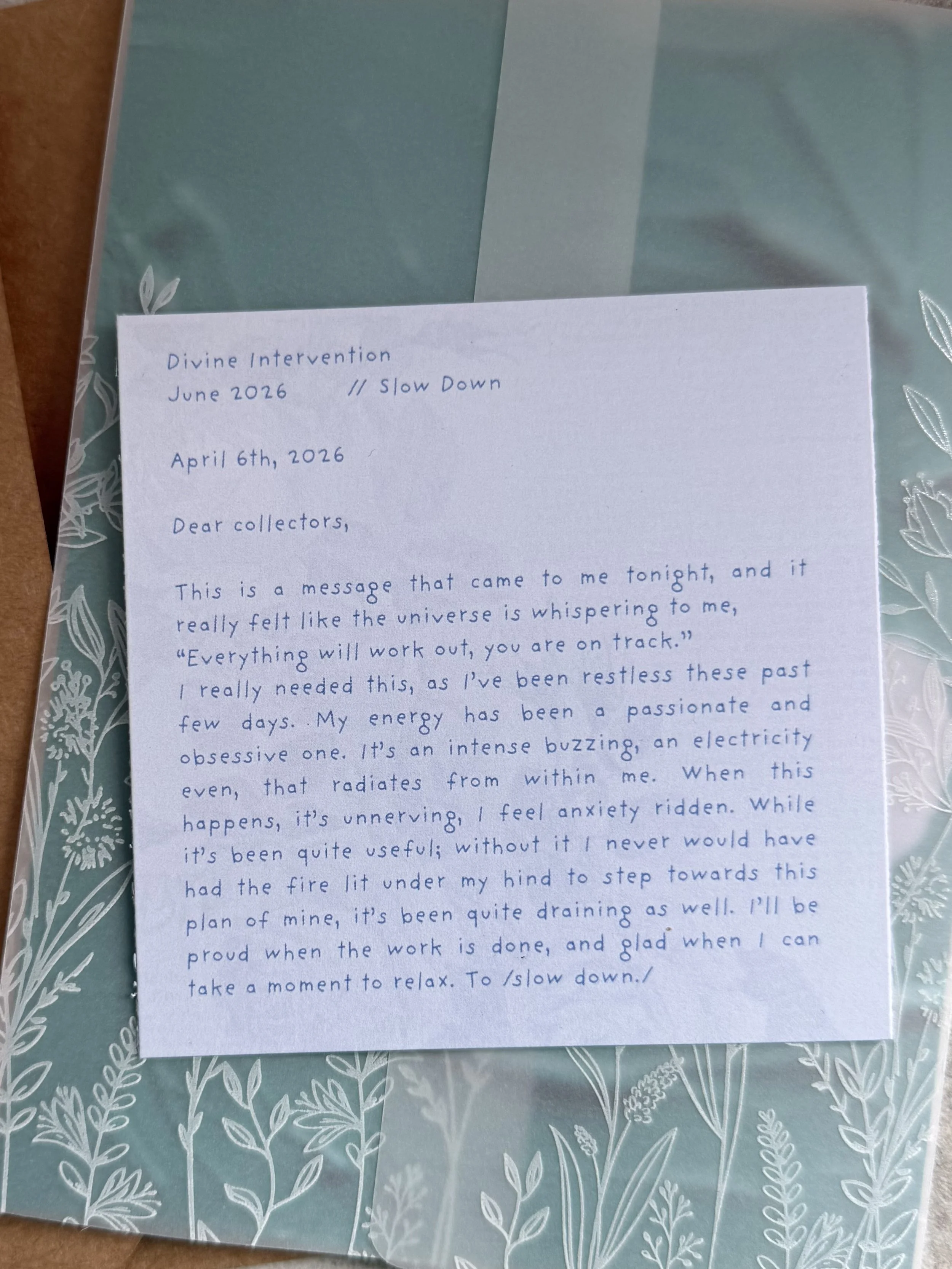 Receive a written piece by the artist herself. One paragraph explaining the inspiration and meaning behind your print, along with a personal ‘journal entry’ updating you on her artistic and personal life. Sharing lessons she learns along the way. This is a shared journey of self growth.